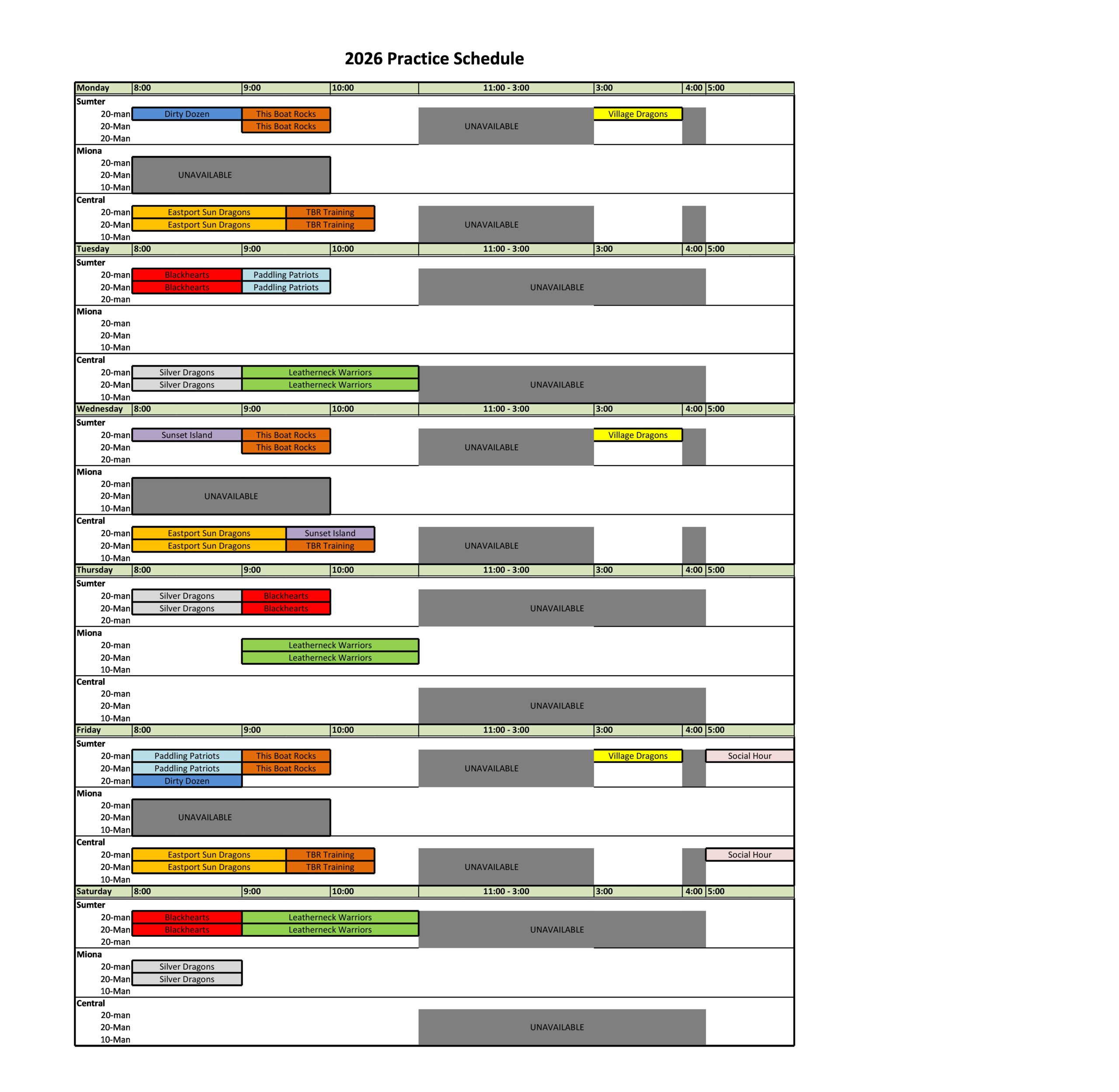 Grand Masters manages 9 boats shared among Lake Miona, Lake Sumter and Central Lake (in Eastport). All teams share responsibility for maintenance and cleaning of the boats. Teams also agree upon practice times. Any changes to the schedule must be submitted by a team captain and approved in writing (or email) by the Grand Master’s Practice Hours Coordinator, currently Linda Braun .